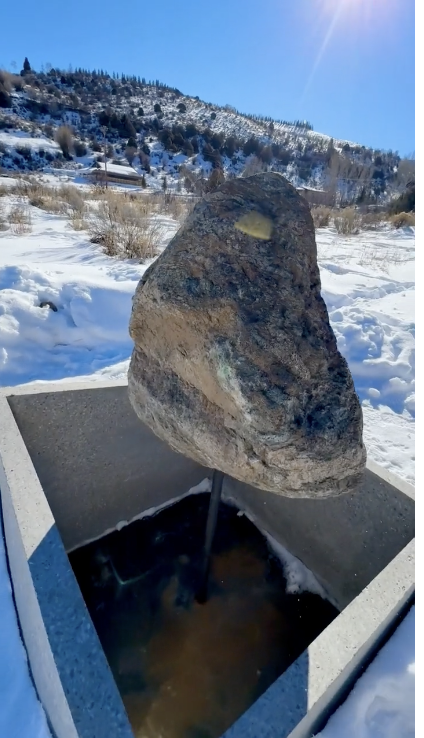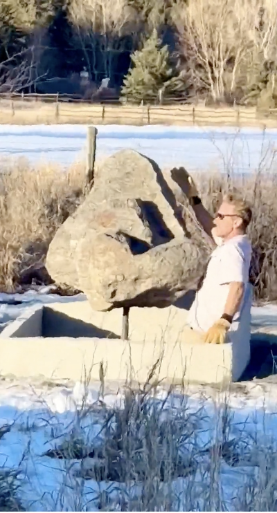 Hells Bells.. ‘embrace your demons’. To me, this piece represents my struggles while trying to identify having bipolar and getting my arms around the vices, pitfalls, and madness. This Colorado granite boulder has tiered splits (not an easy process) to give a bell-like shape. Torching adds color and texture to the face. The ‘pit’ or foundation is 4’ x 4’ x 4’ cement. I proud of this cement work as it requires multiple off-camber pours and has a polished finish. This piece will receive a torched and blackened face shortly.